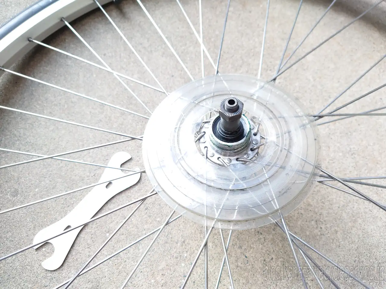 ハブ両端のロックナット(17mm)をスパナやソケットレンチで締める方向に微量動かす。玉当り具合を確認。